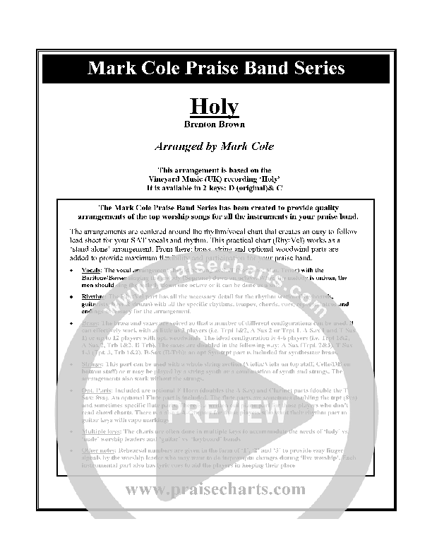 Download the Orchestration for Holy by Brenton Brown, from the album Songs Of Mark Cole. This song was arranged by Mark Cole in the key of C, D.