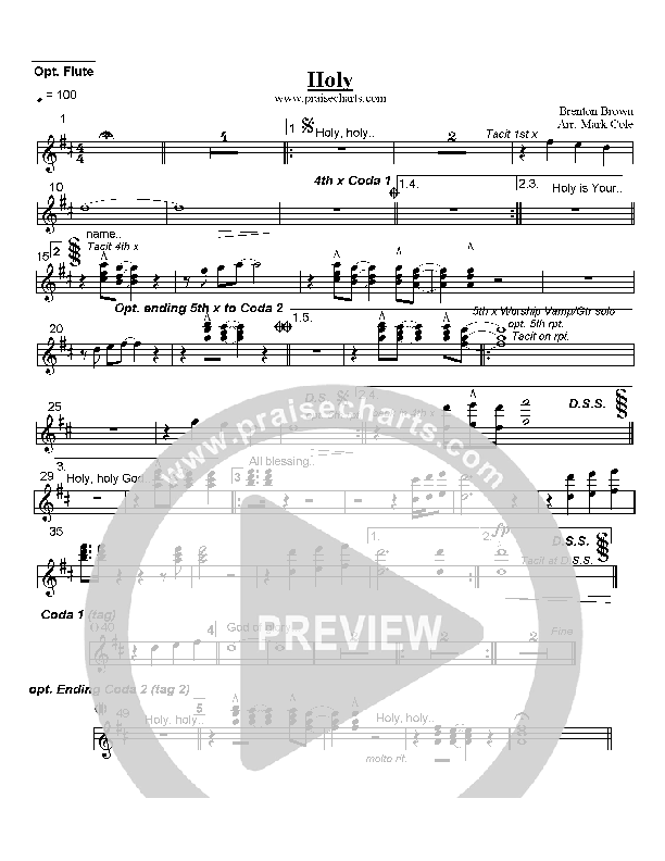 Download the Flute sheet music for Holy by Brenton Brown, from the album Songs Of Mark Cole. This song was arranged by Mark Cole in the key of C, D.