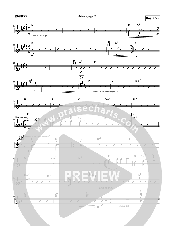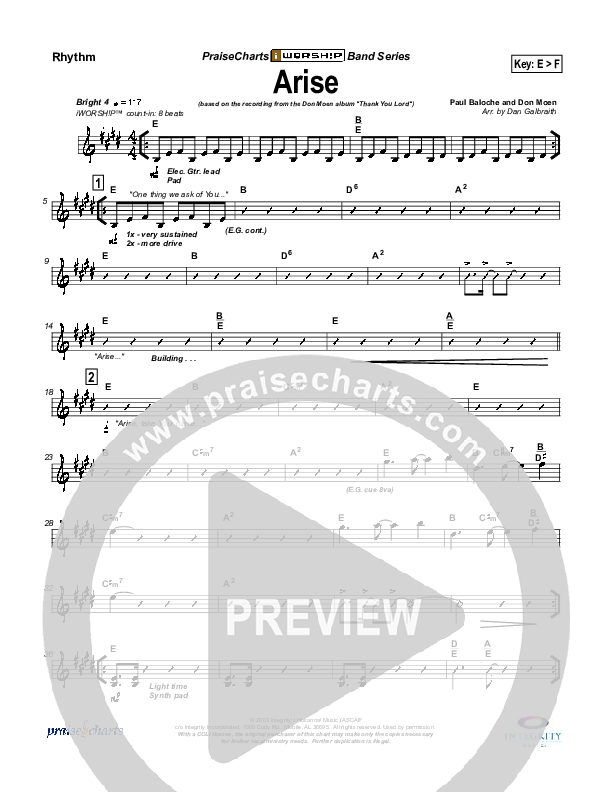 Download the Rhythm Chart for Arise by Don Moen, from the album Thank You Lord. This song was arranged by Daniel Galbraith in the key of E, Eb.