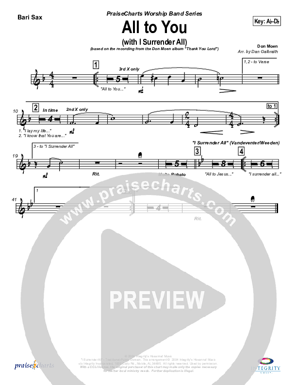 Download the Bari Sax sheet music for All To You (with I Surrender All) by Don Moen, from the album Thank You Lord. This song was arranged by Daniel Galbraith in the key of Ab, G.