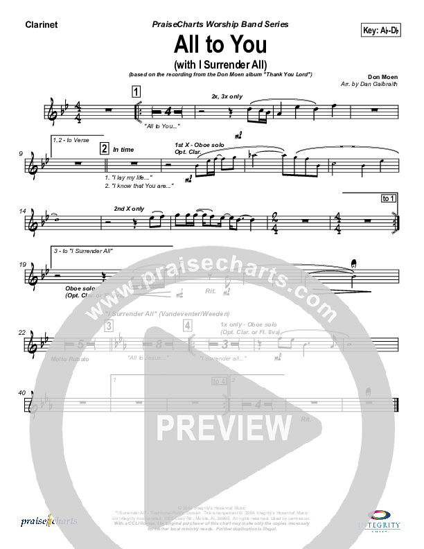 Download the Orchestration for All To You (with I Surrender All) by Don Moen, from the album Thank You Lord. This song was arranged by Daniel Galbraith in the key of Ab, G.