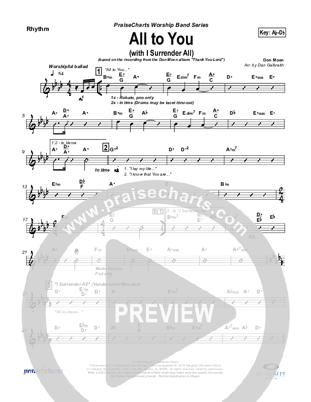 Download the Rhythm Chart for All To You (with I Surrender All) by Don Moen, from the album Thank You Lord. This song was arranged by Daniel Galbraith in the key of Ab, G.