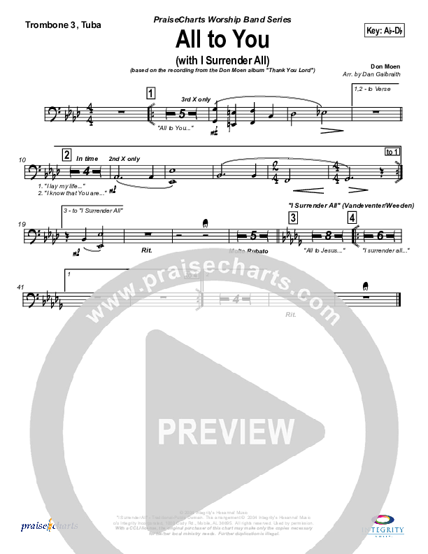 Download the Trombone 3/Tuba sheet music for All To You (with I Surrender All) by Don Moen, from the album Thank You Lord. This song was arranged by Daniel Galbraith in the key of Ab, G.