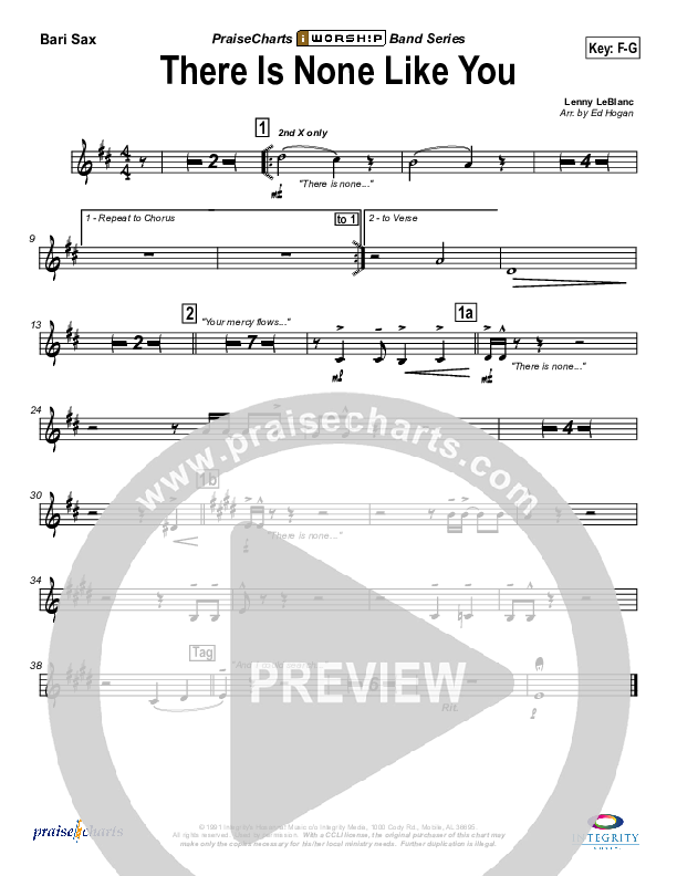 Download the Bari Sax sheet music for There Is None Like You by Lenny LeBlanc, from the album iWorship: DVD G. This song was arranged by Ed Hogan in the key of F, G.