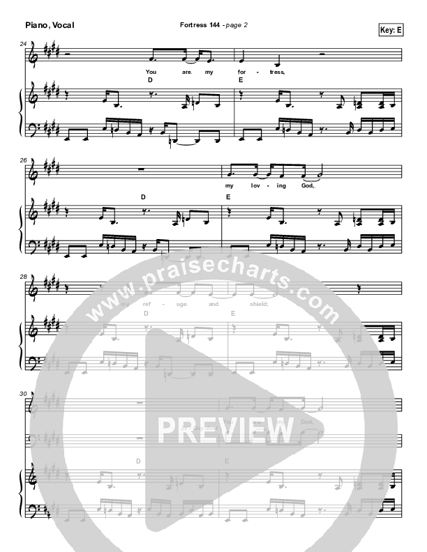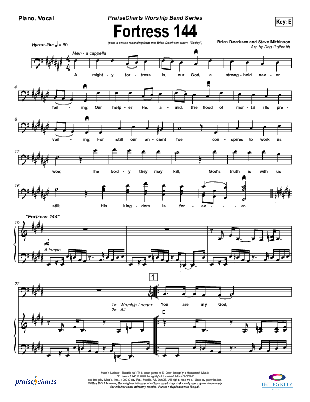 Download the sheet music for Fortress 144 (with A Mighty Fortress) by Brian Doerksen, from the album Today. This song was arranged by Daniel Galbraith in the key of E.