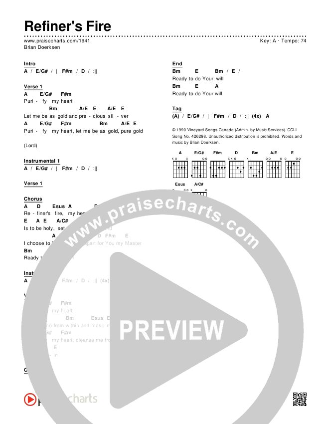 Download the PDF Chord Charts for Refiner's Fire by Brian Doerksen, from the album Today. This song was arranged by Daniel Galbraith in the key of E, F.