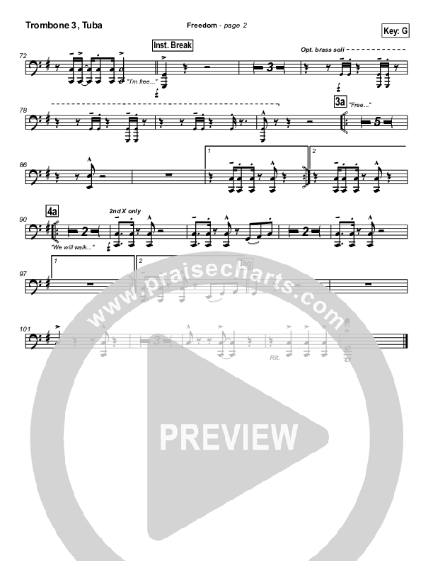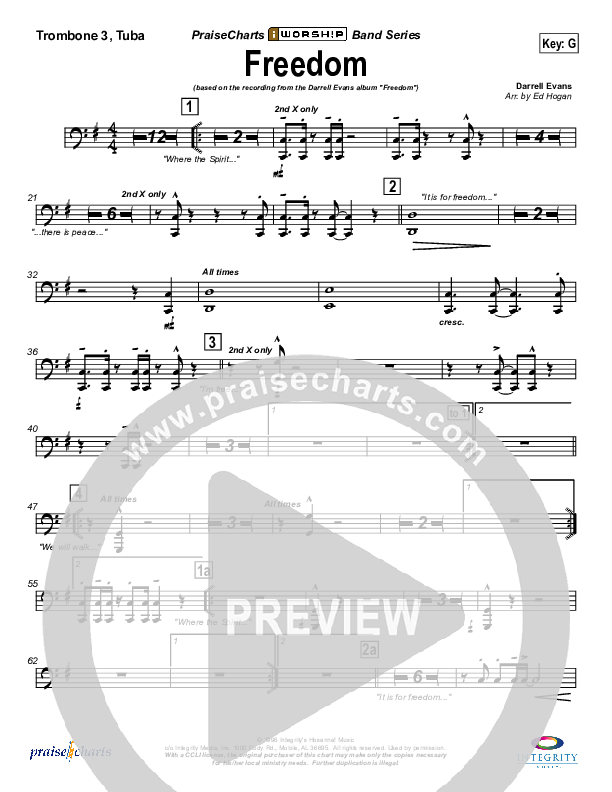 Download the Trombone 3/Tuba sheet music for Freedom by Darrell Evans, from the album iWorship: DVD G. This song was arranged by Ed Hogan in the key of F, G.