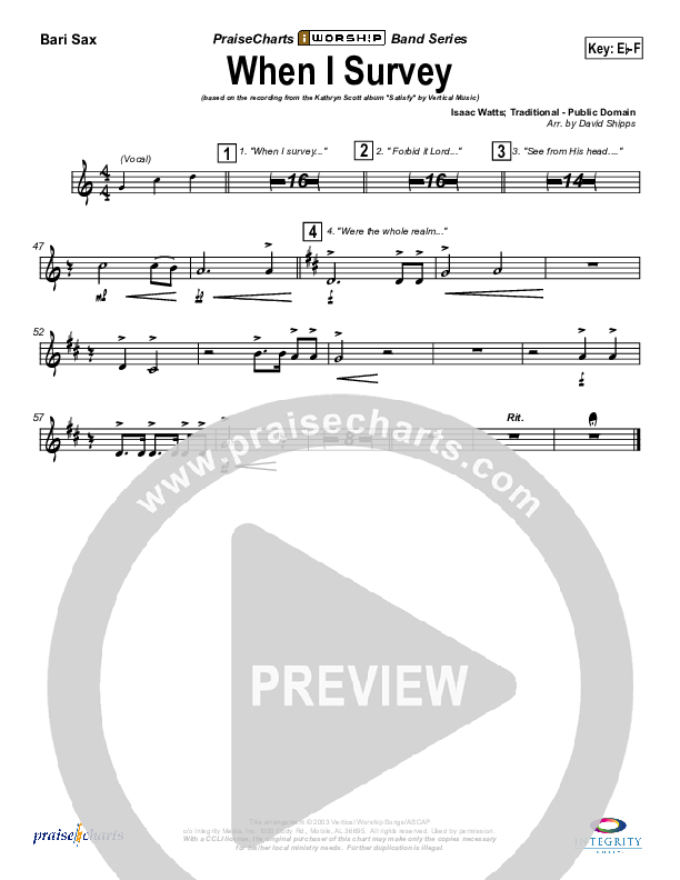 Download the Bari Sax sheet music for When I Survey (The Wondrous Cross) by Kathryn Scott, from the album iWorship: DVD H. This song was arranged by David Shipps in the key of Eb, F.