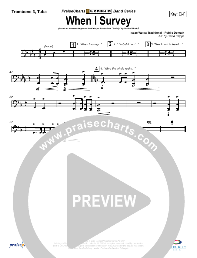 Download the Orchestration brass parts for When I Survey (The Wondrous Cross) by Kathryn Scott, from the album iWorship: DVD H. This song was arranged by David Shipps in the key of Eb, F.