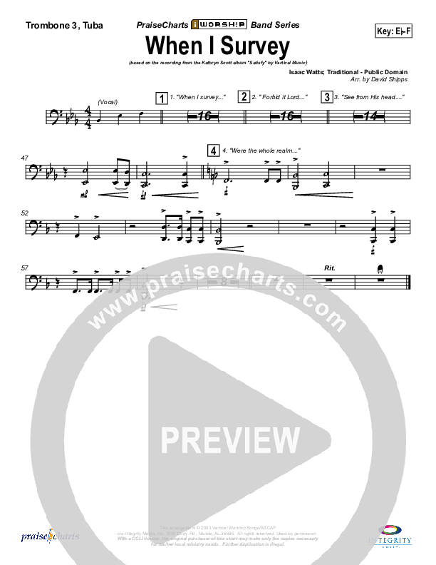 Download the Trombone 3/Tuba sheet music for When I Survey (The Wondrous Cross) by Kathryn Scott, from the album iWorship: DVD H. This song was arranged by David Shipps in the key of Eb, F.