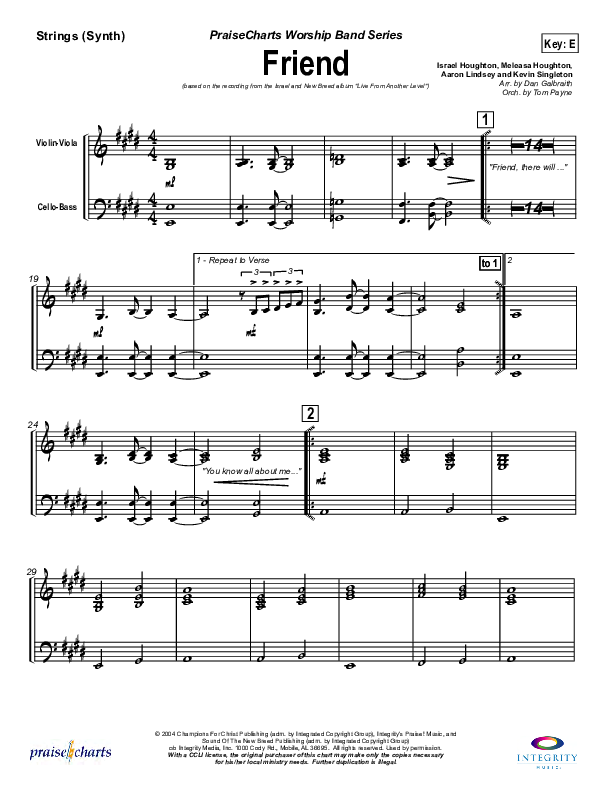 Download the Orchestration for Friend by Israel Houghton, from the album Live From Another Level. This song was arranged by Daniel Galbraith / Tom Payne in the key of E, Eb.