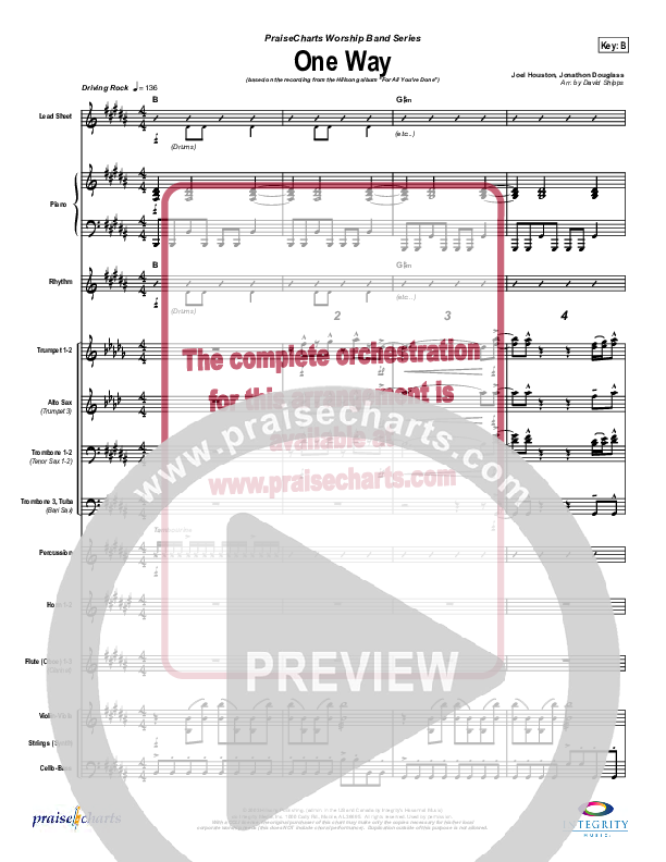 Download the Orchestration for One Way by Hillsong Worship, from the album For All You've Done. This song was arranged by David Shipps in the key of B, Bb.