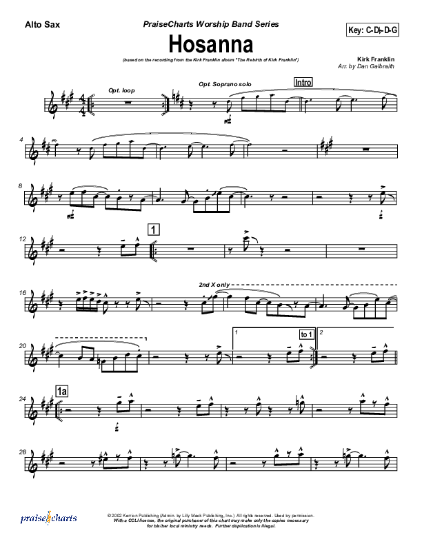 Download the AltoSax sheet music for Hosanna by Kirk Franklin, from the album The Rebirth Of Kirk Franklin. This song was arranged by Daniel Galbraith in the key of Bb, C.