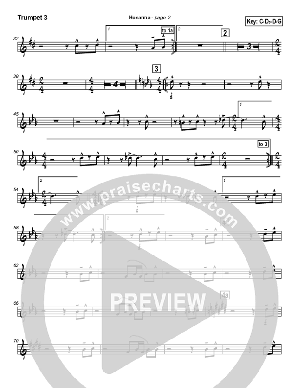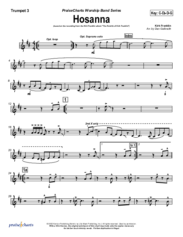 Download the Trumpet 3 sheet music for Hosanna by Kirk Franklin, from the album The Rebirth Of Kirk Franklin. This song was arranged by Daniel Galbraith in the key of Bb, C.