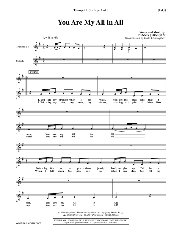 Download the Orchestration for You Are My All In All by Dennis Jernigan, from the album Word Music Now. This song was arranged by Keith Christopher in the key of E, F.