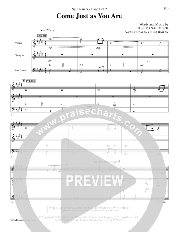 Download the Orchestration for Come Just As You Are by Joseph Sabolink, from the album Word Music Now. This song was arranged by David Winkler in the key of E, F.