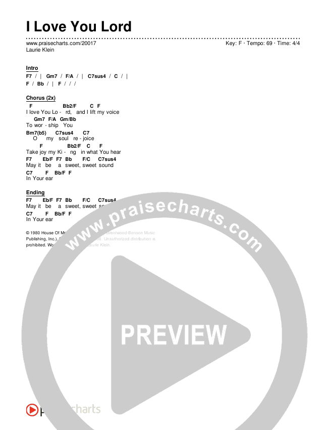 Download the PDF Chord Charts for I Love You Lord by Laurie Klein, from the album Word Music Now. This song was arranged by Douglas A. Holck / Andrew High in the key of F, G.