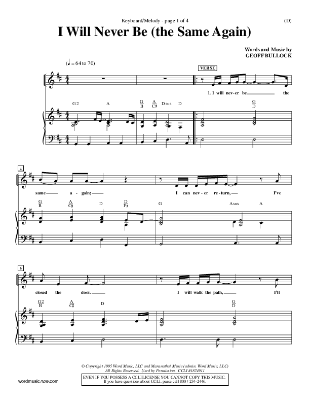 Download the sheet music for I Will Never Be by Geoff Bullock, from the album Word Music Now.