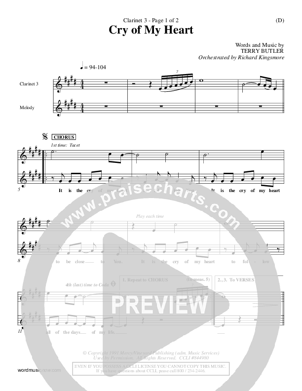 Download the Orchestration for Cry of My Heart by Terry Butler, from the album Word Music Now.