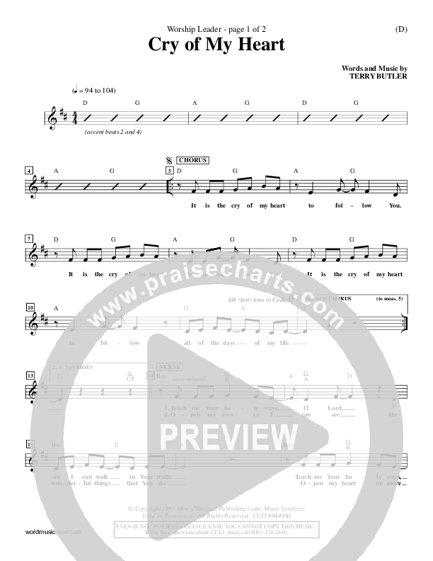 Download the Orchestration for Cry of My Heart by Terry Butler, from the album Word Music Now.