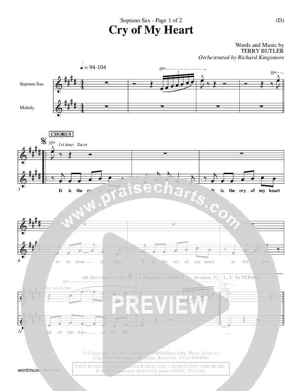 Download the Orchestration for Cry of My Heart by Terry Butler, from the album Word Music Now.