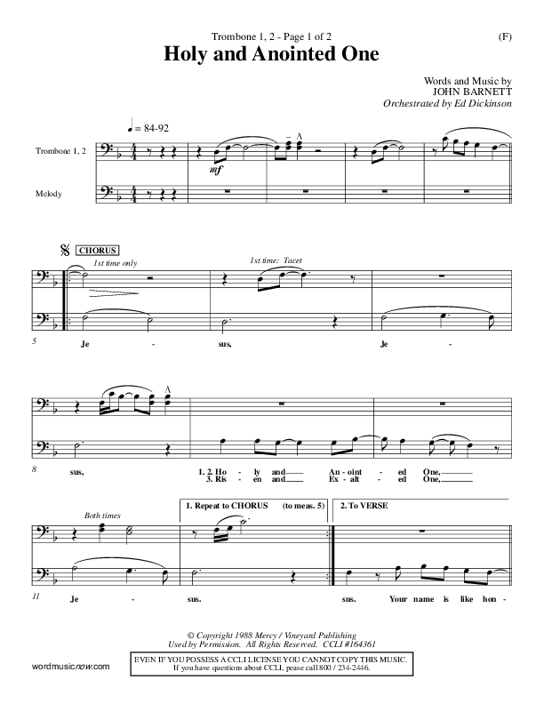 Download the Trombone 1,2 sheet music for Holy And Anointed One by John Barnett, from the album Word Music Now.