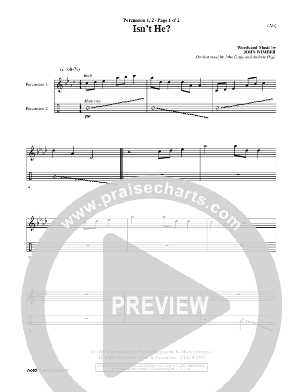 Download the Orchestration for Isn't He by John Wimber, from the album Word Music Now. This song was arranged by John Gage / Andrew High in the key of Ab, G.