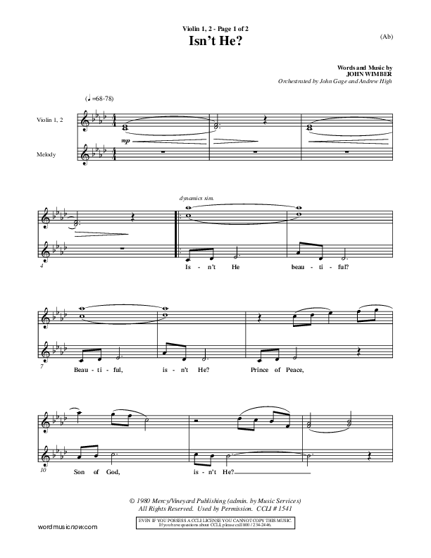 Download the Violin sheet music for Isn't He by John Wimber, from the album Word Music Now. This song was arranged by John Gage / Andrew High in the key of Ab, G.