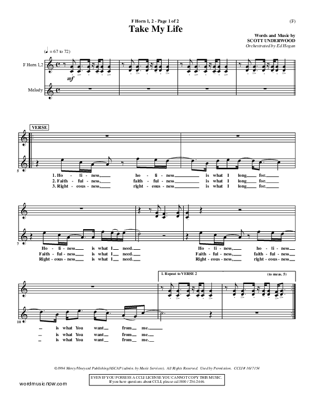 Download the French Horn sheet music for Take My Life by Scott Underwood, from the album Word Music Now.