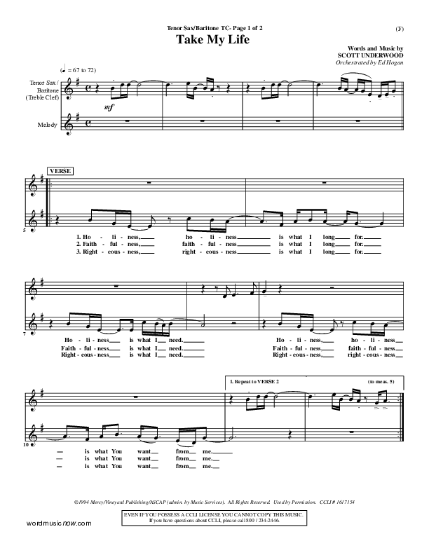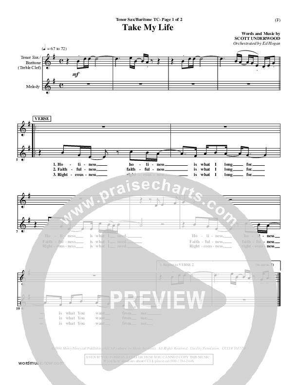 Download the Orchestration for Take My Life by Scott Underwood, from the album Word Music Now.