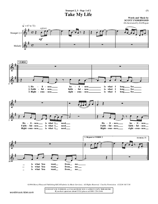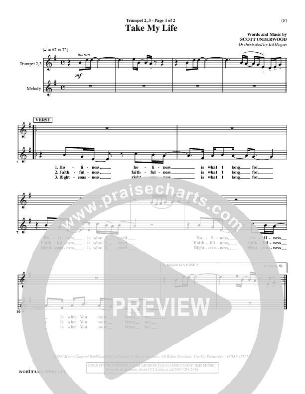 Download the Orchestration for Take My Life by Scott Underwood, from the album Word Music Now.