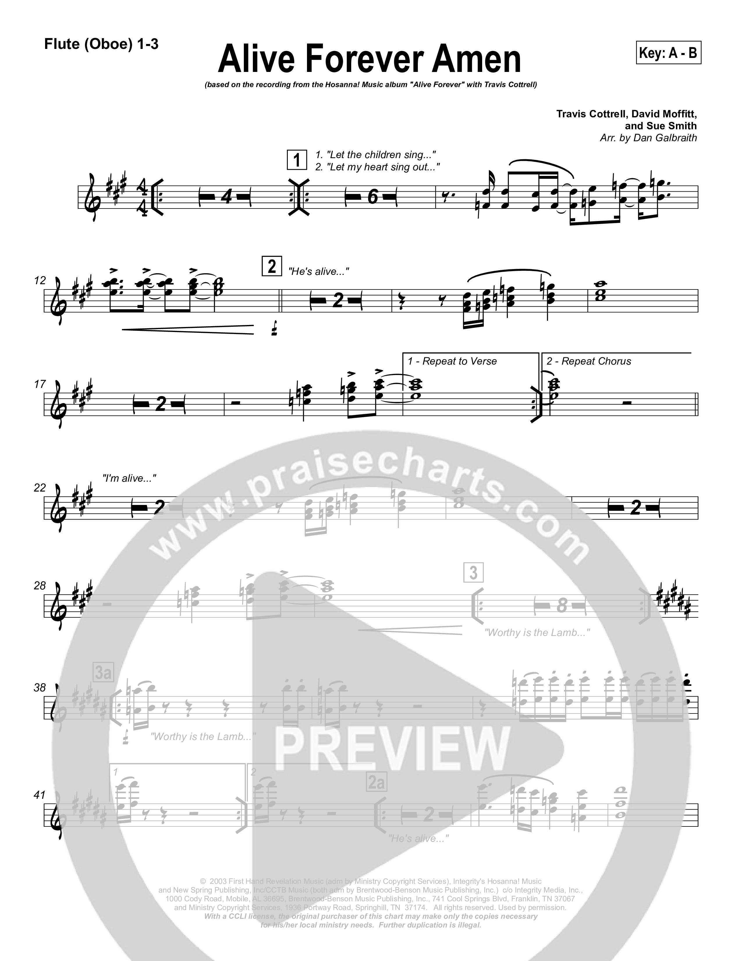 Download the Flute/Oboe sheet music for Alive Forever Amen by Travis Cottrell, from the album Alive Forever. This song was arranged by Daniel Galbraith in the key of Bb, C.