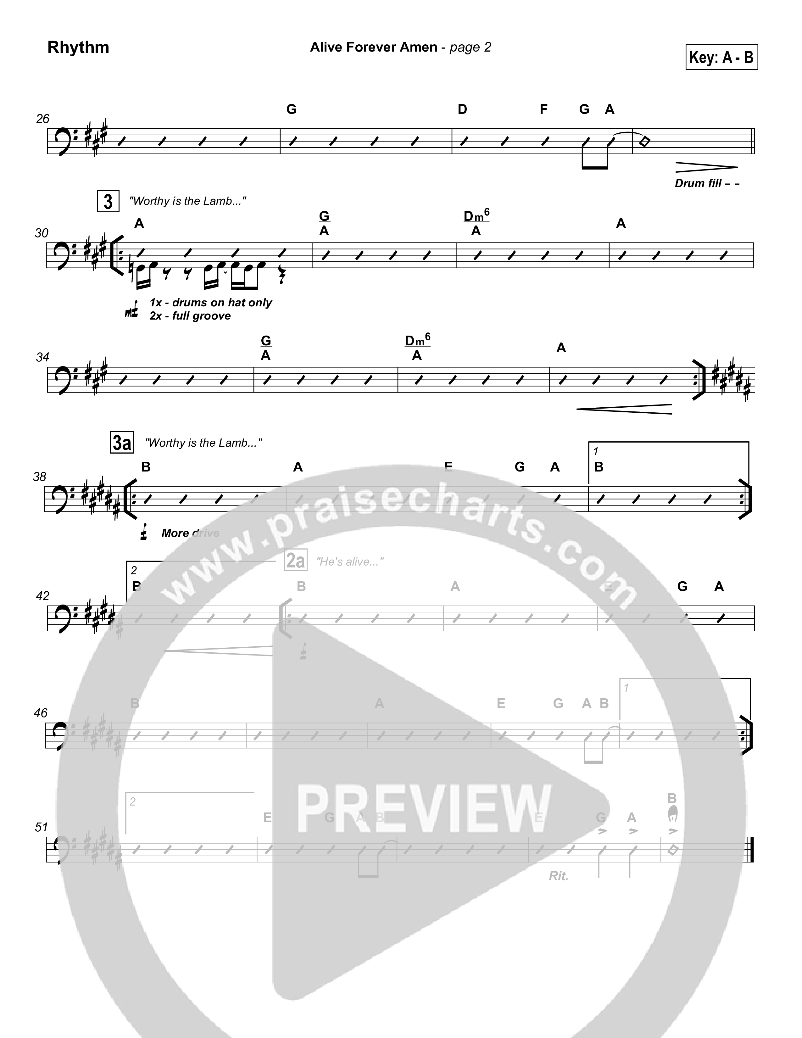 Download the Rhythm Chart for Alive Forever Amen by Travis Cottrell, from the album Alive Forever. This song was arranged by Daniel Galbraith in the key of Bb, C.
