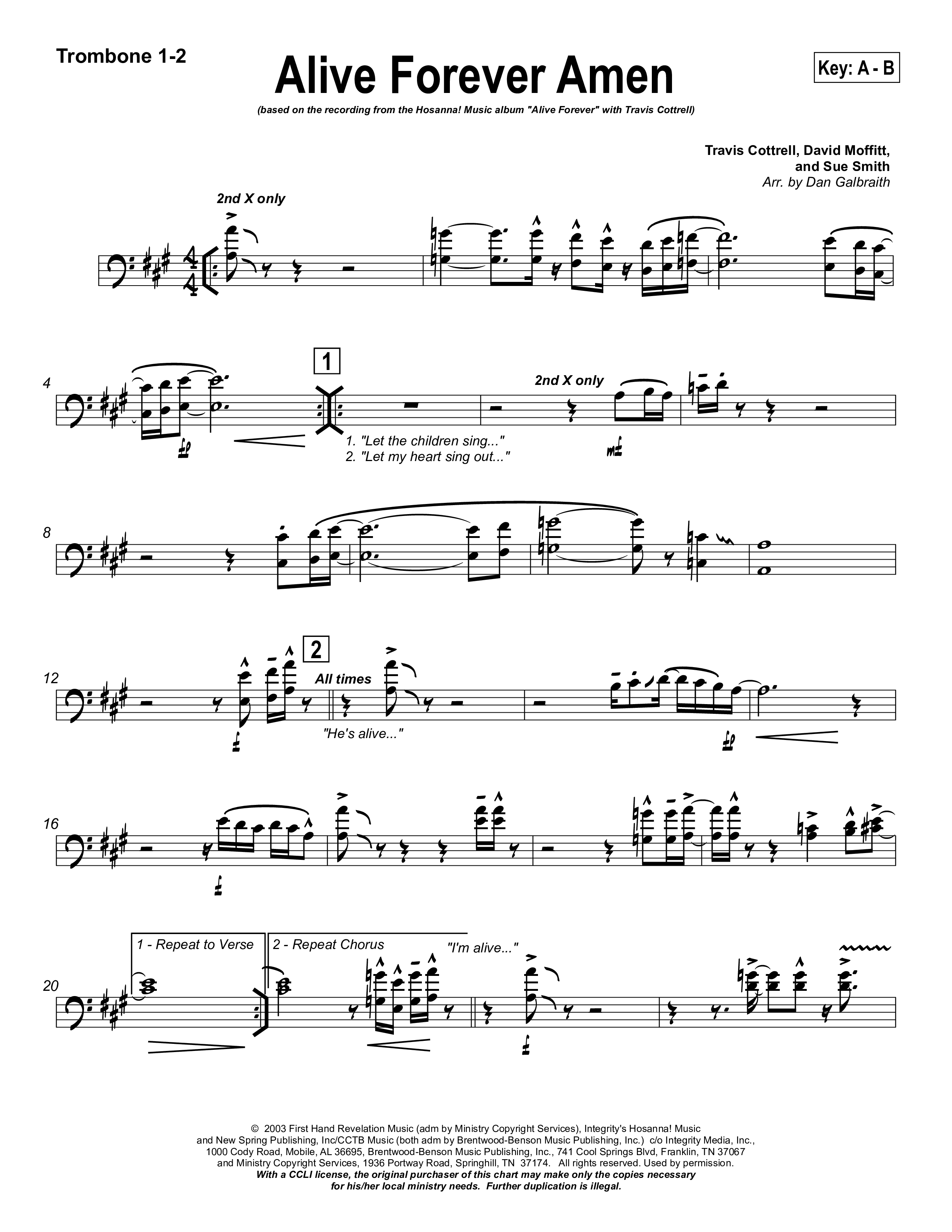 Download the Trombone 1,2 sheet music for Alive Forever Amen by Travis Cottrell, from the album Alive Forever. This song was arranged by Daniel Galbraith in the key of Bb, C.