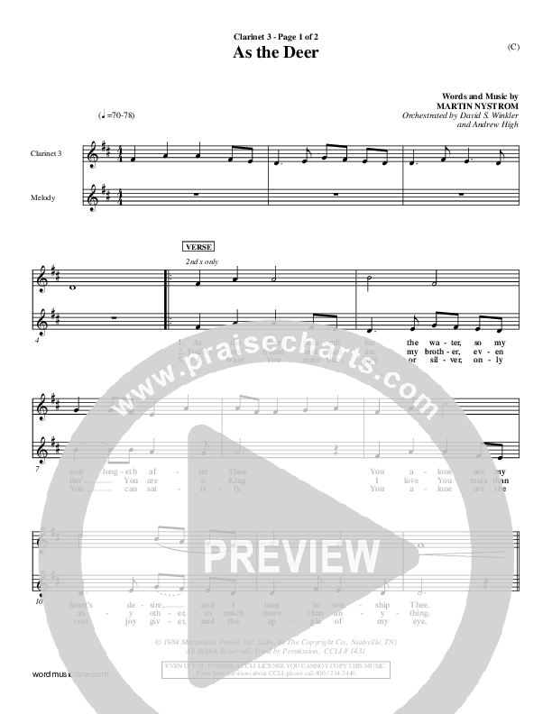 Download the Orchestration for As The Deer by Martin Nystrom, from the album Word Music Now. This song was arranged by David S. Winkler / Andrew High in the key of C, Db.