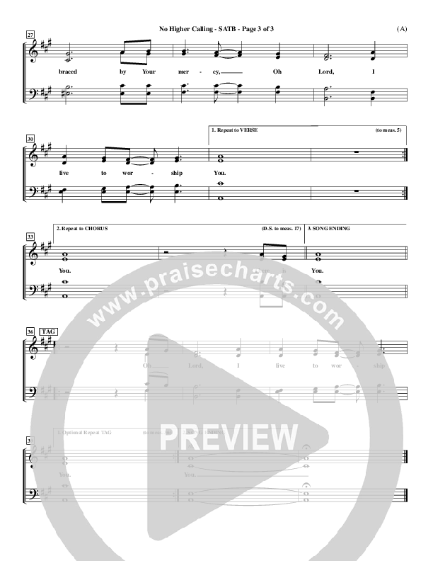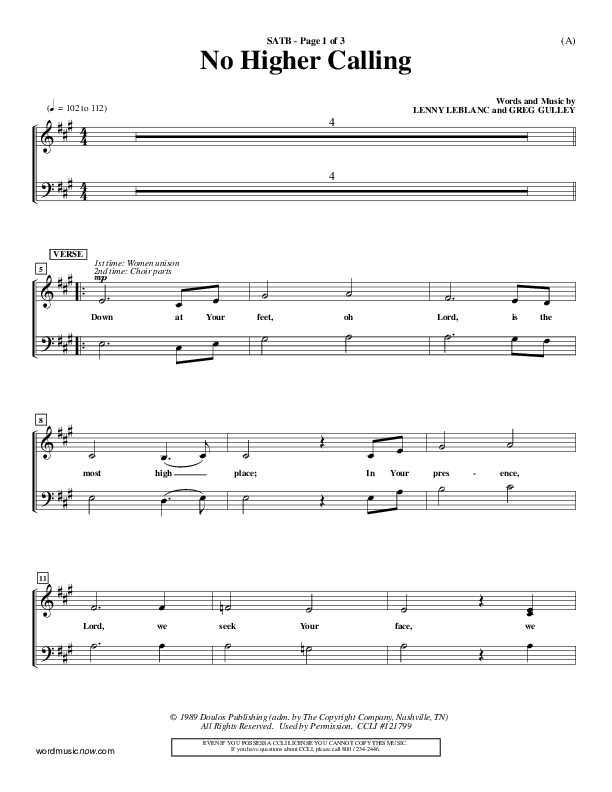 Download the Choir Sheet for No Higher Calling by Lenny LeBlanc, from the album Word Music Now.