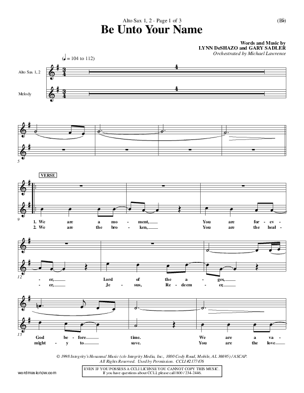 Download the Alto Sax 1,2 sheet music for Be Unto Your Name by Lynn DeShazo, from the album Word Music Now.