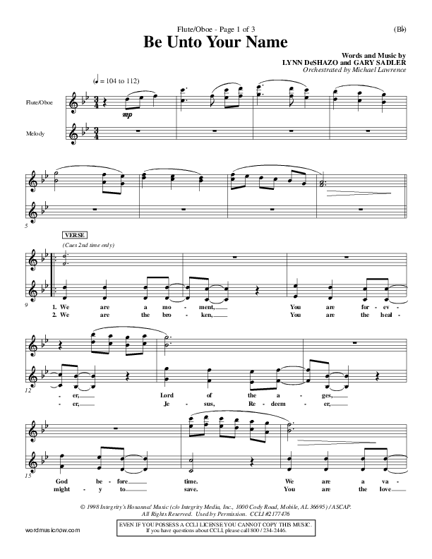 Download the Flute/Oboe sheet music for Be Unto Your Name by Lynn DeShazo, from the album Word Music Now.