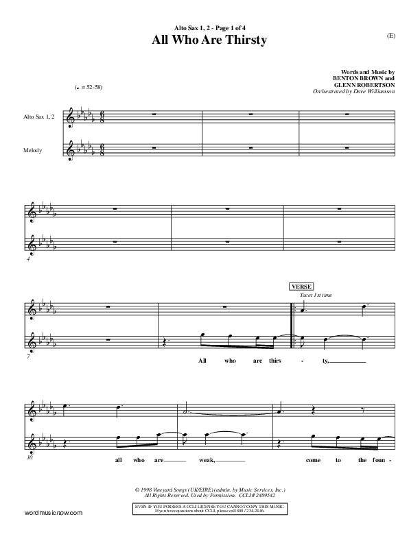 Download the Alto Sax 1,2 sheet music for All Who Are Thirsty by Brenton Brown, from the album Word Music Now. This song was arranged by Dave Williamson in the key of E.
