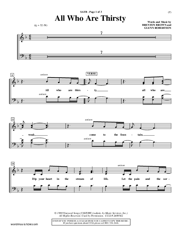 Download the Choir Sheet for All Who Are Thirsty by Brenton Brown, from the album Word Music Now. This song was arranged by Dave Williamson in the key of E.