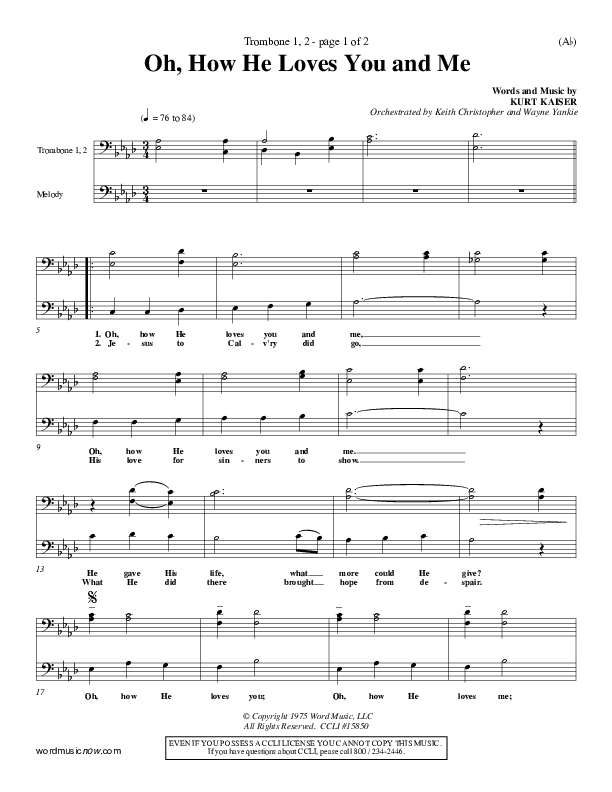 Download the Trombone 1,2 sheet music for Oh How He Loves You And Me by Kurt Kaiser, from the album Word Music Now. This song was arranged by Keith Christopher / Wayne Yankie in the key of Ab, G.