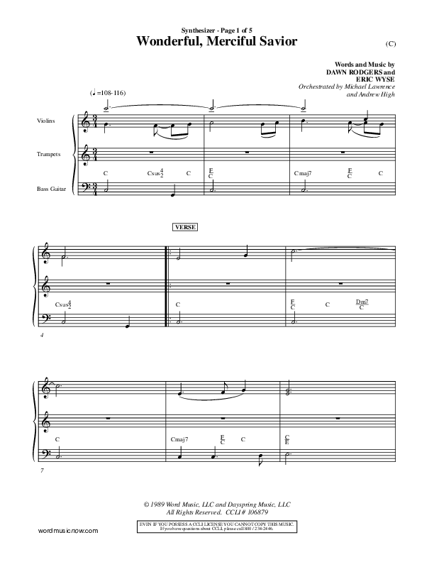 Download the Orchestration for Wonderful Merciful Savior by Eric Wyse, from the album Word Music Now. This song was arranged by Word Music in the key of C, Db.