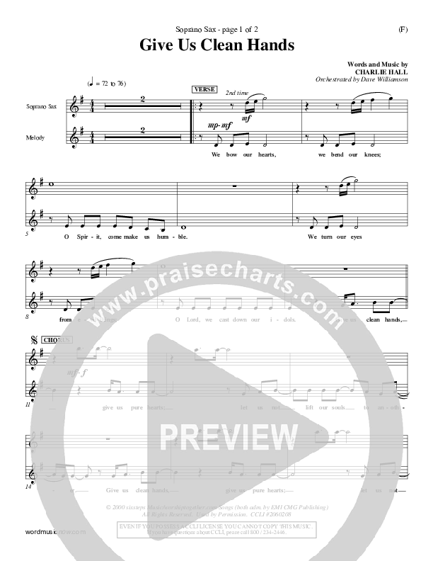 Download the Orchestration for Give Us Clean Hands by Charlie Hall, from the album Word Music Now. This song was arranged by Dave Williamson in the key of F, G.