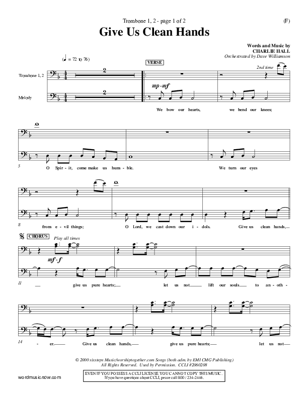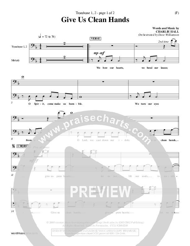 Download the Trombone 1,2 sheet music for Give Us Clean Hands by Charlie Hall, from the album Word Music Now. This song was arranged by Dave Williamson in the key of F, G.