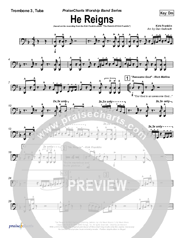 Download the Orchestration for He Reigns (with Awesome God) by Kirk Franklin, from the album The Rebirth Of Kirk Franklin. This song was arranged by Daniel Galbraith in the key of Cm, Dm.