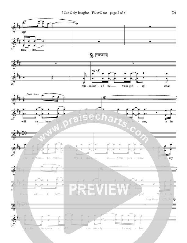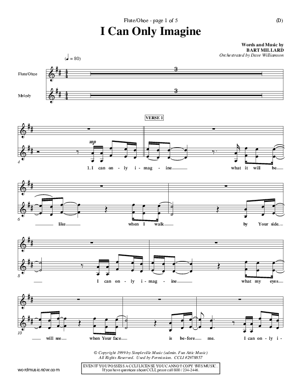 Download the Flute sheet music for I Can Only Imagine by MercyMe, from the album Word Music Now. This song was arranged by Word Music in the key of D, Eb.