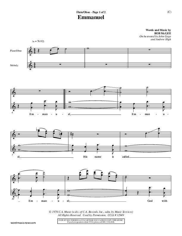 Download the Flute/Oboe sheet music for Emmanuel by Bob McGee, from the album Word Music Now. This song was arranged by John Gage / Andrew High in the key of C, Db.
