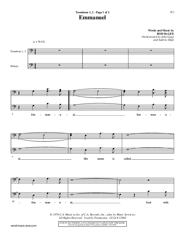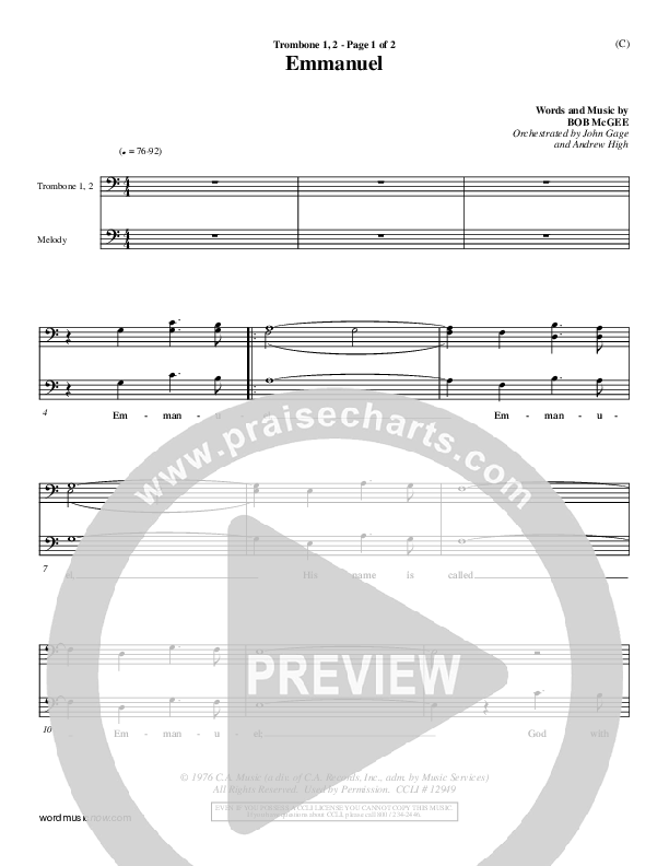 Download the Trombone 1,2 sheet music for Emmanuel by Bob McGee, from the album Word Music Now. This song was arranged by John Gage / Andrew High in the key of C, Db.