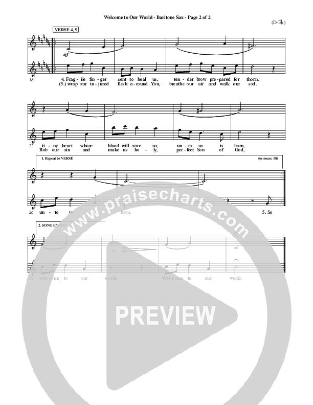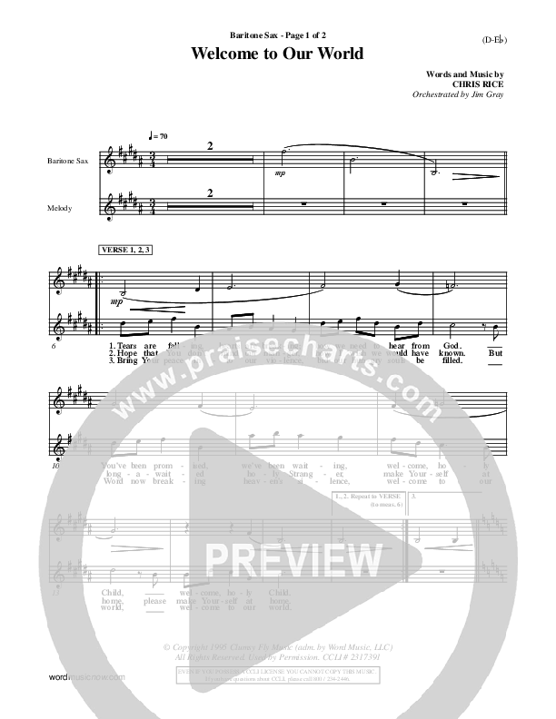 Download the Bari Sax sheet music for Welcome To Our World by Chris Rice, from the album Word Music Now. This song was arranged by Jim Gray in the key of D, E.