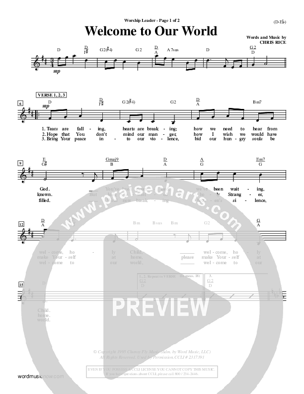 Download the Orchestration for Welcome To Our World by Chris Rice, from the album Word Music Now. This song was arranged by Jim Gray in the key of D, E.